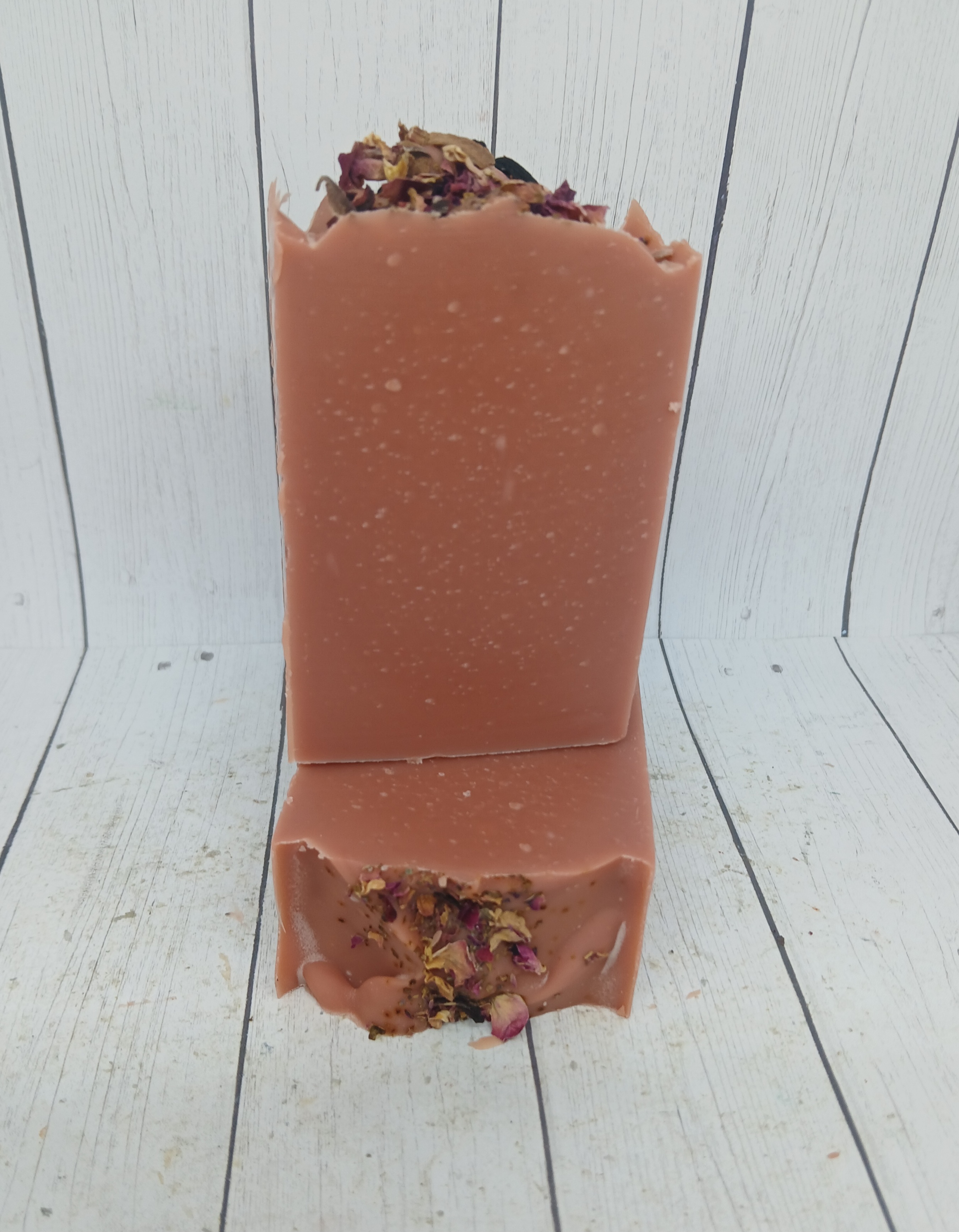 Ingredients: Olive oil, coconut oil, avocado oil, Shea butter, castor oil, rose kaolin clay, dried rose petals, dried hibiscus flowers, phthalate free fragrance oil, sodium hydroxide (saponifying agent).