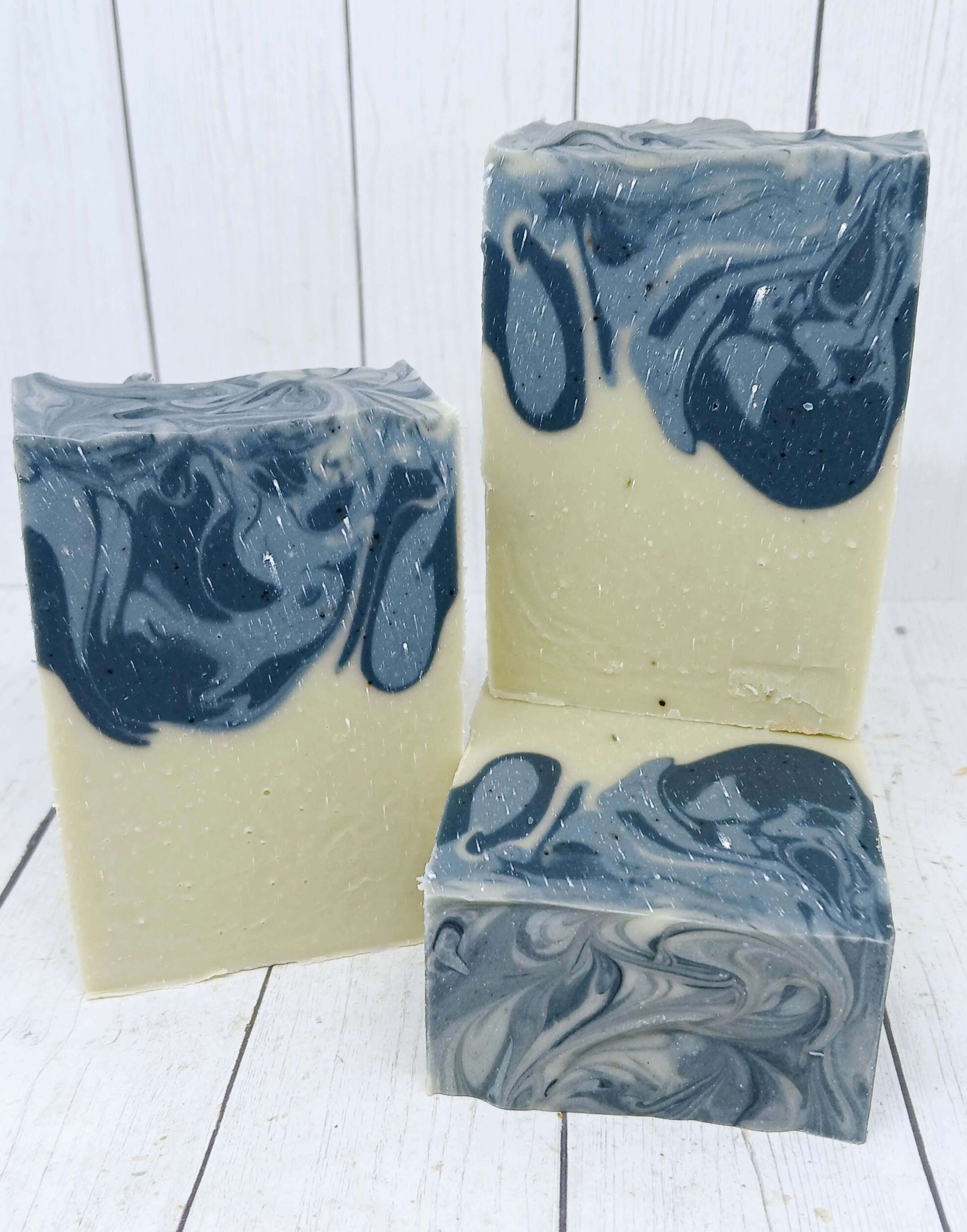 Ingredients: Olive oil, coconut oil, avocado oil, shea butter, castor oil, indigo root powder, activated charcoal, phthalate free fragrance oil and sodium hydroxide (saponifying agent)