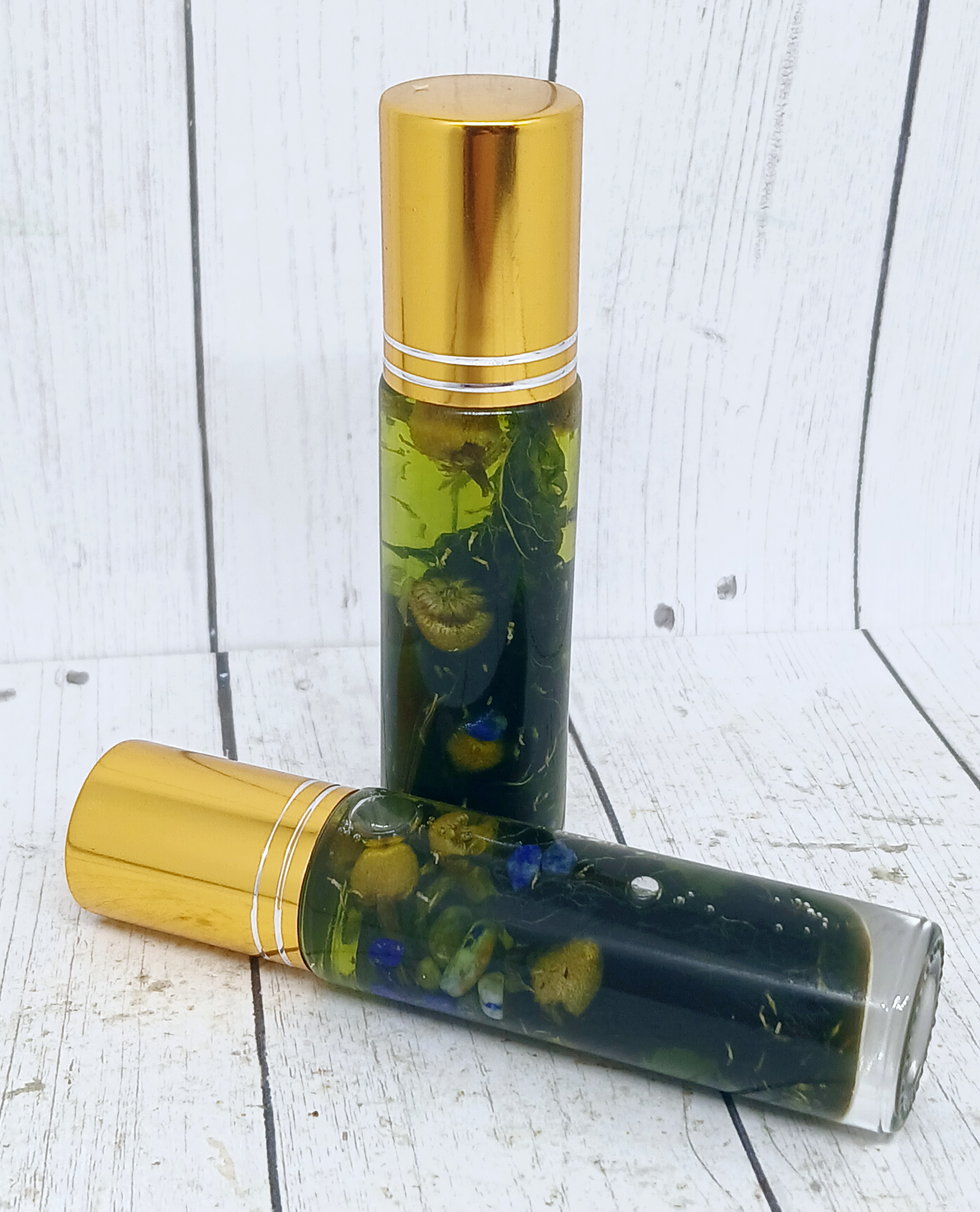 Ingredients: Essential oil blend (Ho wood oil, lavender, spearmint, blue tansy), chamomile flowers, wild mint leaves, lapis gemstones in jojoba oil.
