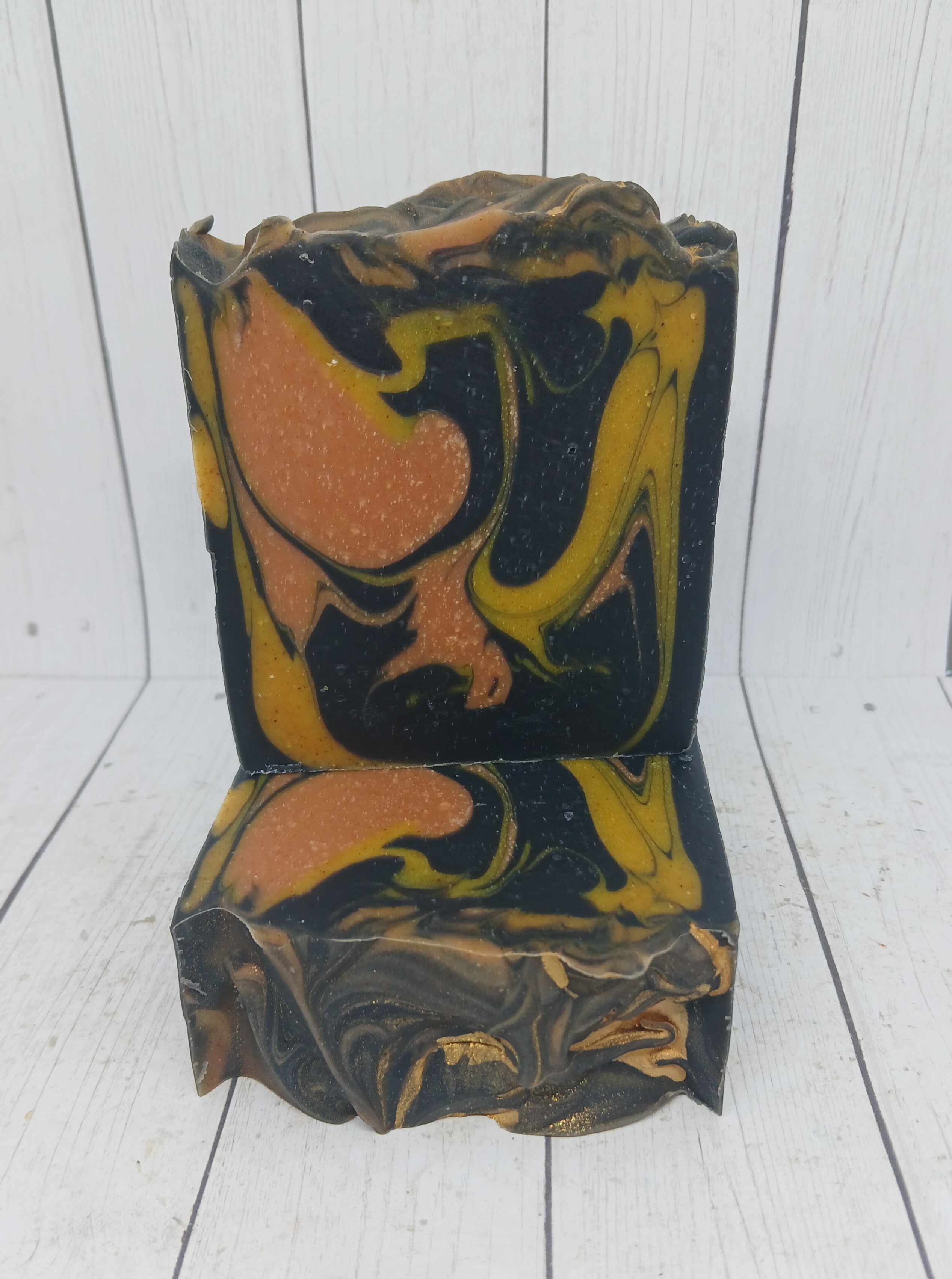 Each bar is a work of art, featuring the intense hues of activated charcoal, red Brazilian clay, and gold Brazilian clay. The dynamic swirls and layers capture the essence of flickering flames and glowing embers, making every soap bar a unique masterpiece.