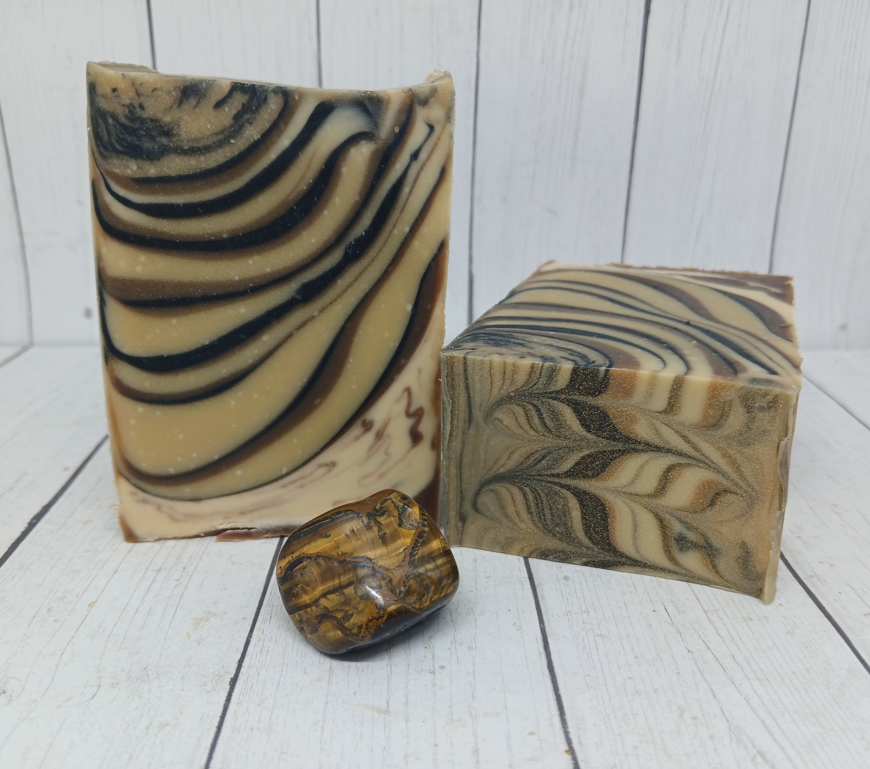 Each bar is a one-of-a-kind masterpiece, intricately swirled with the rich, earthy tones of cocoa powder and activated charcoal to replicate the mesmerizing bands of a Tiger's Eye stone.